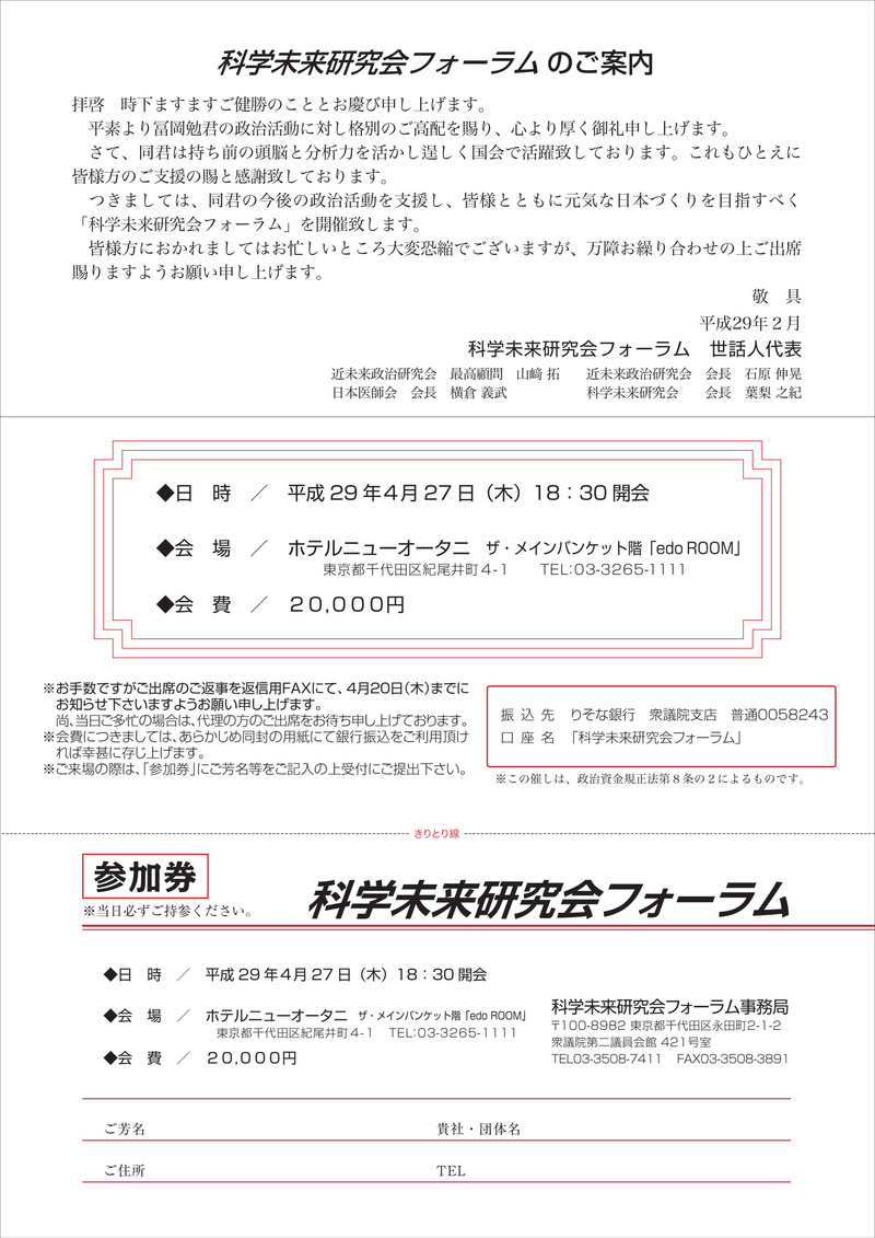 科学未来研究会フォーラムのご案内 国政報告会 Twitter Facebook はてブ Pocket LINE コピー 2017.02.08 2017/2/8(水) 4月27日(木)18:30からホテルニューオータニにて「科学未来研究会フォーラム」が開催されます。 参加希望の方は事務局(長崎:095-860-0200 または 東京:03-3508-7411)までご連絡いただけると幸いです。 皆様のご参加、お待ちしております。 クリックすると画像が大きくなります