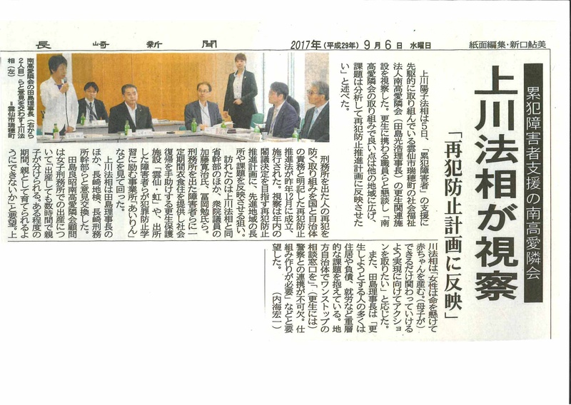 南高愛隣会視察 地域活動 Twitter Facebook はてブ Pocket LINE コピー 2017.09.06 2017/9/5(火) 累犯障がい者の支援に取り組んでおられる雲仙市瑞穂町の社会福祉法人南高愛隣会の更生関連施設に上川陽子法務大臣が視察にこられ、私も同行いたしました。 長崎新聞の記事