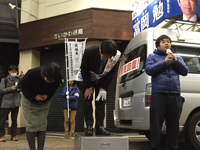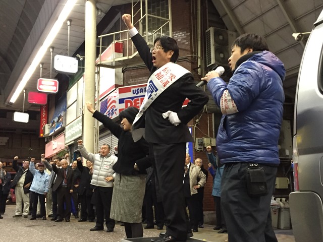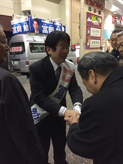 マイク納め 選挙 Twitter Facebook はてブ Pocket LINE コピー 2014.12.13 住吉・中園商店街にて、選挙戦を締めくくるマイク納めを行いました。 師走の寒い中、多くの皆様にご参加頂きましてありがとうございました。 いよいよ明日は投票日です。 冨岡勉を再び国政の場へと送り出して頂きますよう心よりお願い申し上げます。 なんとしてでも景気回復!