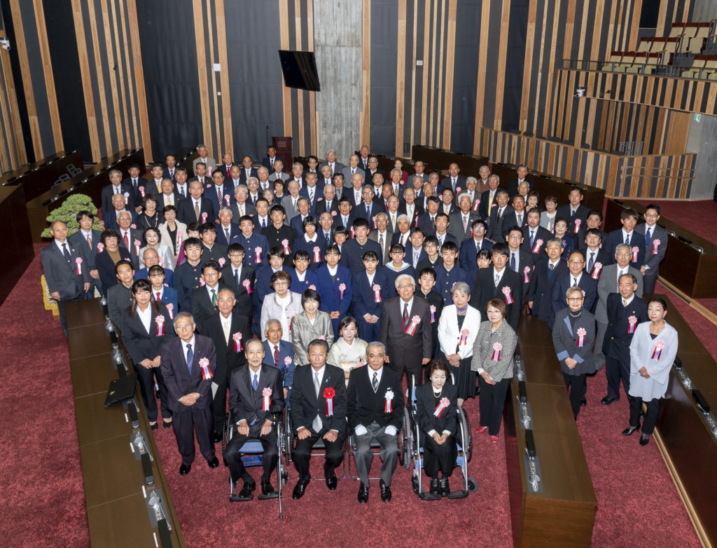 本年は、個人106名と32の団体が表彰されました。地方自治、保健・環境、産業、教育文化ほか、本県に多大な功績があった方々が受賞の栄に浴されました。