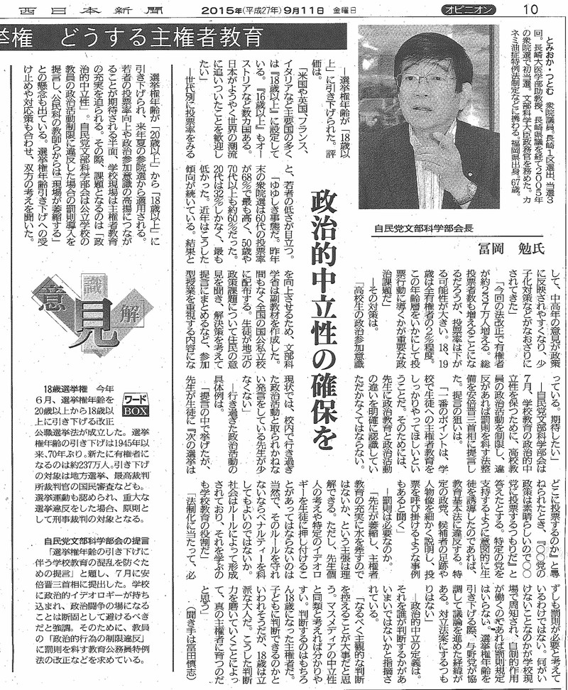 18歳選挙権 どうする主権者教育 国政 Twitter Facebook はてブ Pocket LINE コピー 2019.08.262015.09.11 2015/9/11(金)西日本新聞の記事です。 画像をクリックすると見やすくなります。