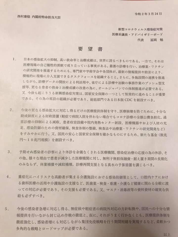 西村経済再生担当大臣へ第1回提言(医系議員・アドバイザリーボード勉強会) 新型コロナウィルス対策 Twitter Facebook はてブ Pocket LINE コピー 2020.03.25 2020/3/24(火)16:00〜 これまで猛スピードで、大隈事務局長、今枝衆議院議員らと6回にわたり行ってきた「新型コロナウィルス感染症対策 医系議員・アドバイザリーボード勉強会」の第1回提言をとりまとめ、 西村康稔 経済再生担当大臣・内閣府特命担当大臣(経済財政政策担当)に提言申し入れを行いました。 (写真の「要望書」は、5ページにわたる提言書の要約バージョンです。) 冨岡 勉さんの投稿 2020年3月24日火曜日 冨岡 勉さんの投稿 2020年3月24日火曜日