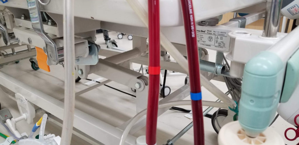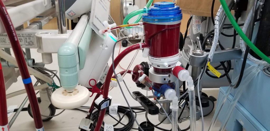 病院長の中尾先生の許可を受け、新型コロナウイルス感染対策を中心的にやっておられる泉川先生にご同行いただき、ECMO(体外式膜型人工肺)装置とその使用の様子を視察をさせていただきました。