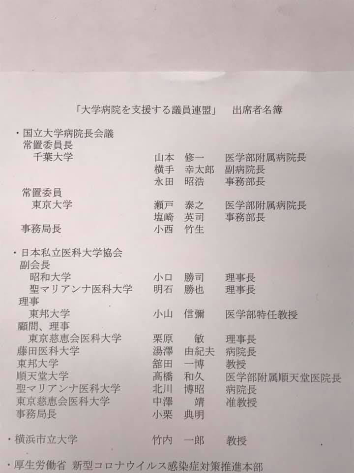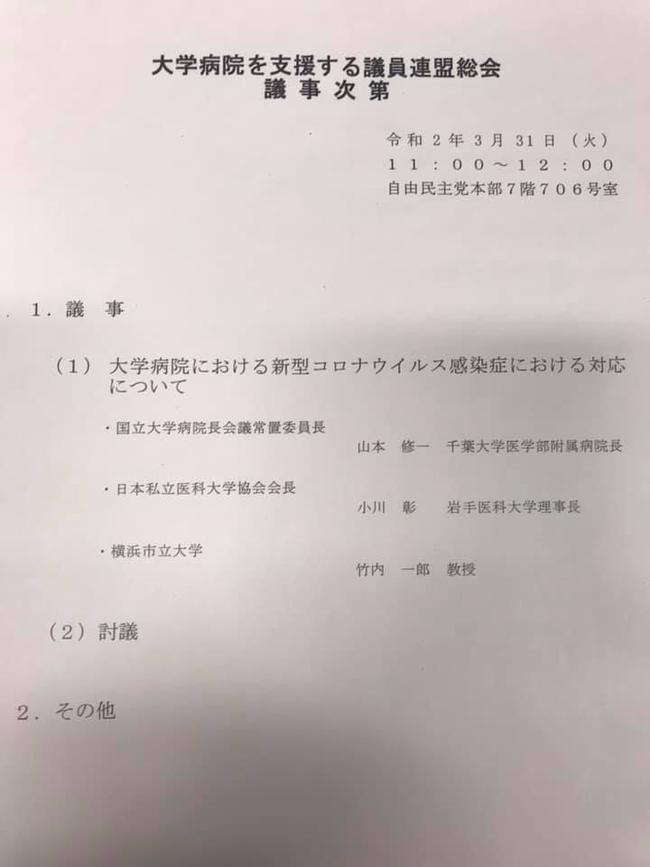 大学病院を支援する議員連盟総会 新型コロナウィルス対策 Twitter Facebook はてブ Pocket LINE コピー 2020.04.012020.03.31 2020/3/31(火)11:00〜 呼びかけを行い、大学病院を支援する議員連盟総会が緊急で開催されました。 冨岡 勉さんの投稿 2020年3月31日火曜日