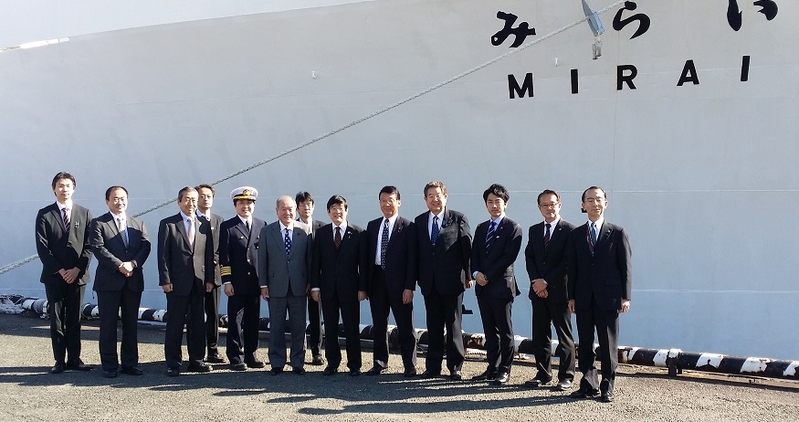 横浜に係留中の海洋地球研究船「みらい」の視察に行きました。「みらい」は以前、長崎県佐世保港にも係留していた原子力船「むつ」の原子炉を撤去した後の船体の半分と新たに作った船尾部分の半分を接合して作られた8700トン余りの我が国が誇る世界最大級の海洋研究船であります。