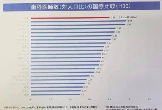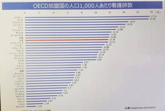 お話した内容は、医師不足の現状、すなわち写真1に見られるようにOECD37カ国中、日本は人口1000人あたり2.4人と、決して多いとは言えず、お医者さんの加重労働が問題となる中、改善の余地があるものと考えられます。