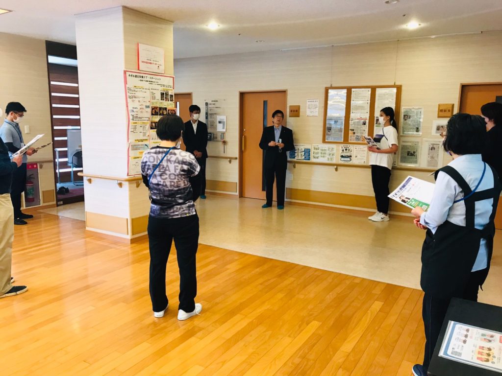 片淵にある特別養護老人ホーム みぎわホーム(白髭 豊理事長 鈴木 稔施設長)の朝礼で、公明党の福澤照充市議とともにご挨拶をさせていただき、これまでの取り組みと、施設におけるコロナ対策などについてお話をしました。