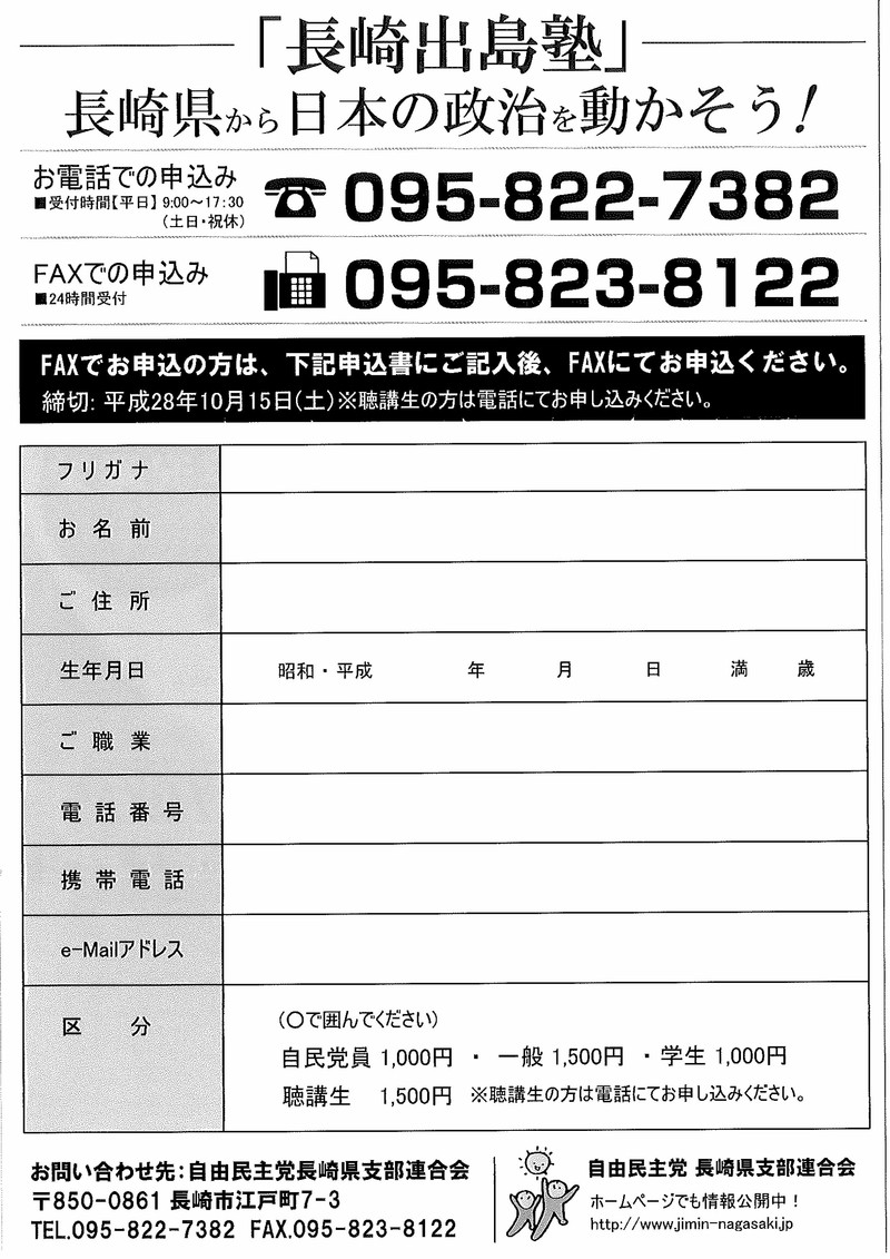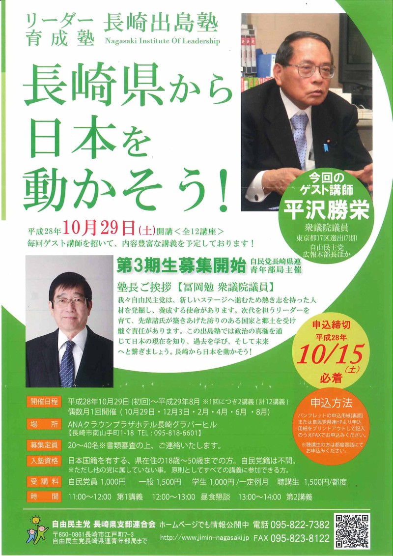 リーダー育成塾「長崎出島塾」開催と第3期生の募集について 自民党長崎 Twitter Facebook はてブ Pocket LINE コピー 2019.08.262016.09.26 自民党長崎県連会長として、長崎出島塾の塾長をしておりますが、このたび10月29日(土)から第3期を開講します。 今回はゲスト講師に衆議院議員の平沢勝栄代議士をお招きし、ご講演をいただく予定となっています。 若者の皆さん、ぜひ参加して、長崎から日本を動かす”力”になってみませんか? お問い合わせは自由民主党長崎県連095-822-7382へお願いいたします。