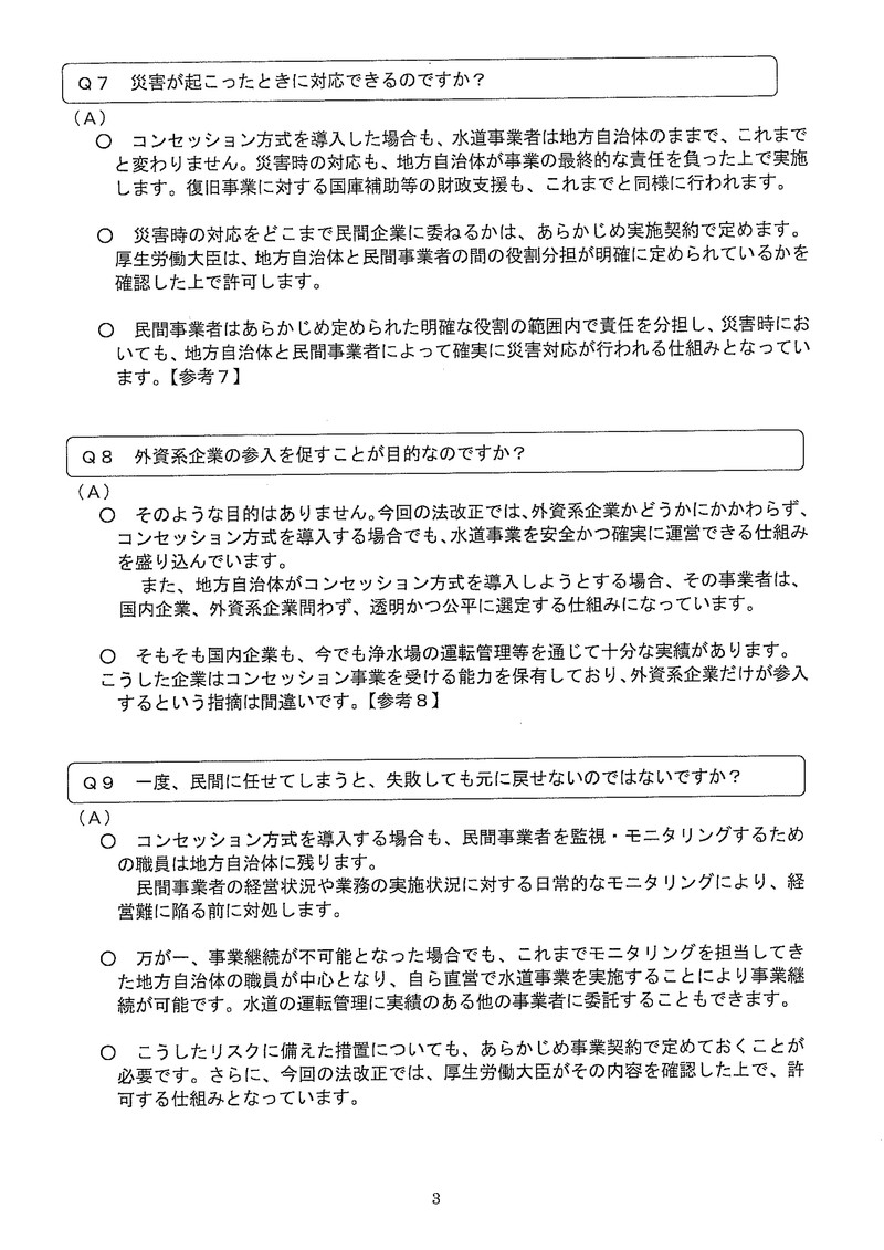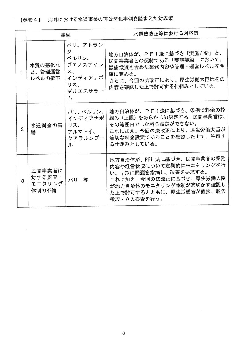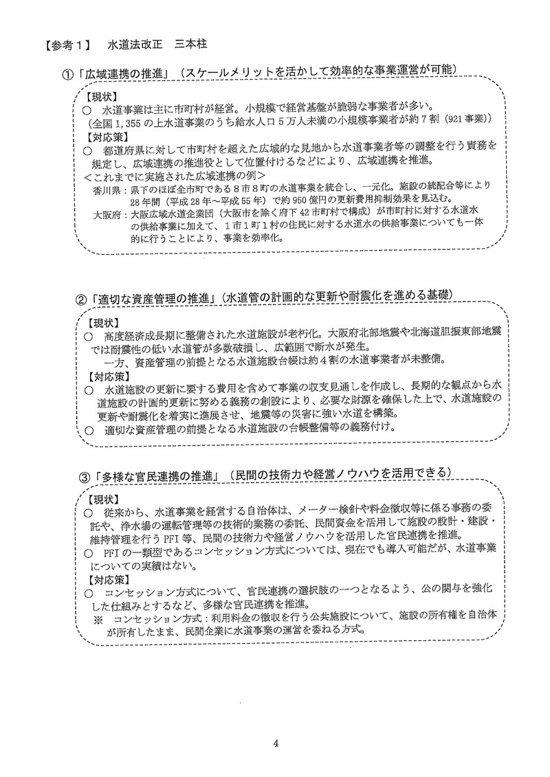 水道法改正法 国政 Twitter Facebook はてブ Pocket LINE コピー 2019.08.262019.01.05 2019/1/5(土) 昨年末の臨時国会にて水道法が改正されました。私が委員長を務める厚生労働委員会にて慎重審議の上、成立をみたところです。 この法律は、施設の老朽化や人口減少に伴う水道料金収入の減少等、深刻な課題に直面している水道事業を見据え、将来にわたって安全で安定的な水の供給を目指すための改正ですが、様々な点においての説明不足や誤解が生じていることは、否めないところです。そこで、以下に主な想定される疑問点に対するご説明を掲載しますので、趣旨ご理解賜りますようお願いいたします。 ↓クリックすると画像が拡大します。